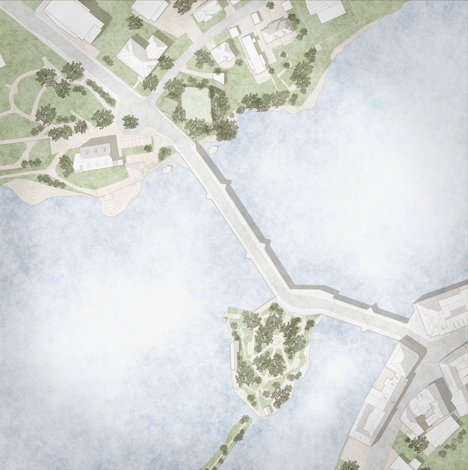 How can you develop a bridgehead with a small customs house and a restaurant? The potential lies in the existing landscape elements. Overgrown retaining walls and old trees characterize the island of "Burg Stein" and the bank area of the customs property. The tree population is rounded off here to form a small park, the castle island and new customs link the two ends of the bridge as a pair to form an ensemble. Both parks have their own character and are an indispensable part of building bridges.
